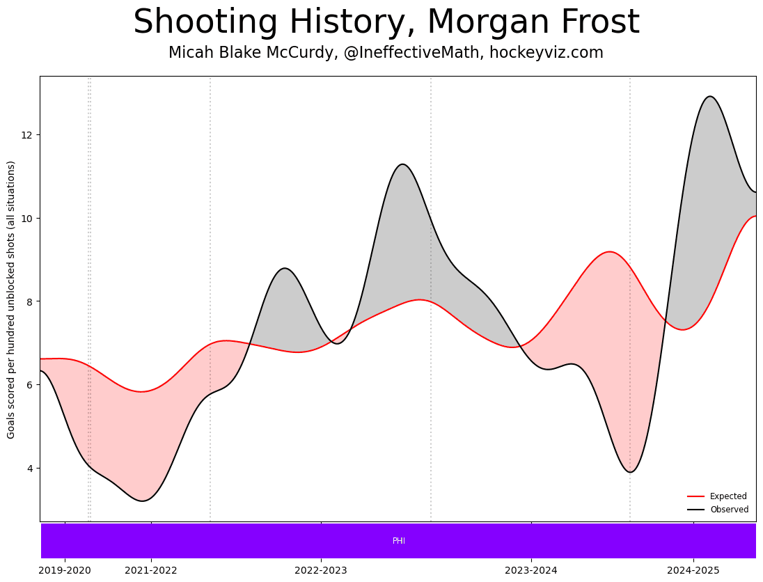 Graph translation: Red is a line that is determined by the chances generated by Frost. The black line tracks actual, tangible production. If the black line is above the red line (grey area) it signifies more scoring than expected chances created – a sign of a better ability to finish off goals. If the black line falls below the red line it shows a struggle to put the puck in the net.