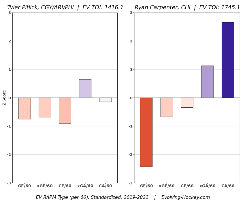 The recognition of Carpenters skill set was first noticed by the Vegas Golden Knights in 2017-18 after acquiring him from the Sharks. He was able to find ample offence at the AHL level but hasn’t really been a scoring player during his time in the NHL. The impact isn’t as bad as one might initially think – being at -2.5 to -3% on offence doesn’t translate into a person being an offensive blackhole.