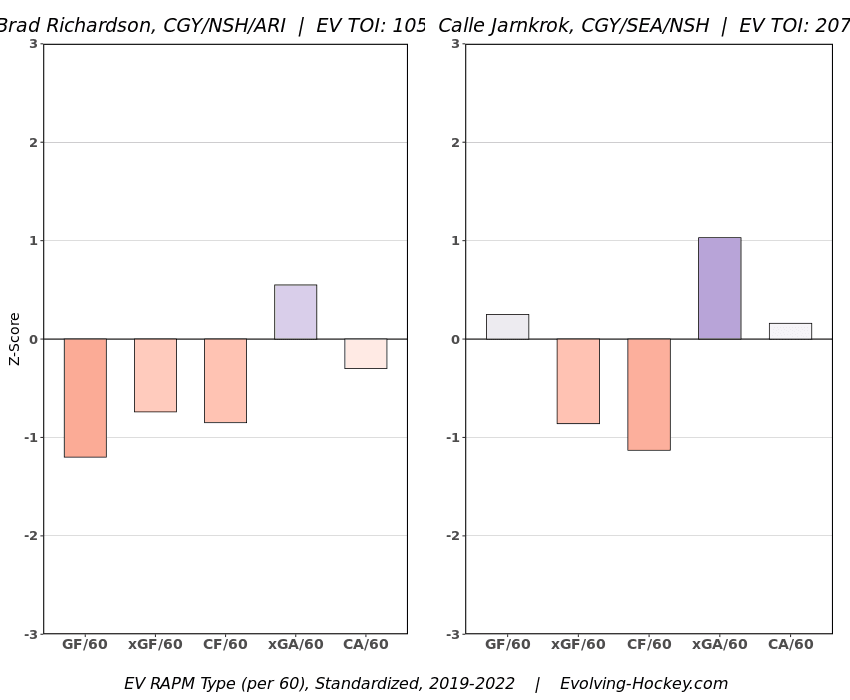 Now again Carpenter is not one to score tons of goals or points, but of the 4 his pure defensive impact is the most value. His CA bar being as high as it is while spending all 3 of those seasons in Chicago – where defence was optional sometimes – is remarkable. Hardly any shot attempts get off from the other team when Carpenter patrols the ice. Add in the offensive improvement Jarnkrok provides over Richardson and the Flames were able to gain two players that have track records of being more proficient on-ice players.