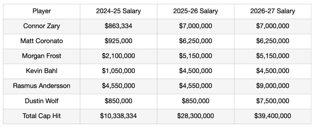 Connor Zary, Matt Coronato, Morgan Frost, and Kevin Bahl all need new contracts after this season. And Dustin Wolf is eligible to sign an extension starting on July 1.