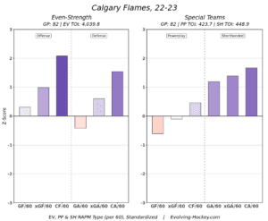 The Flames also finished 14th in goals for percentage (GF%) at 51.92 percent and 4th, yes, 4th overall at 5v5 in expected goals for percentage (xGF%). In goals for per 60 minutes, the team ranked eighth overall with 2.8 at 5v5, and they also ranked eighth overall in expected goals against per 60 minutes.