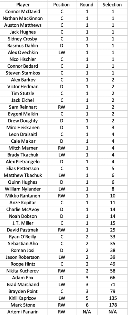 I thought it would be interesting to take a look at where these elite players in the NHL were drafted.