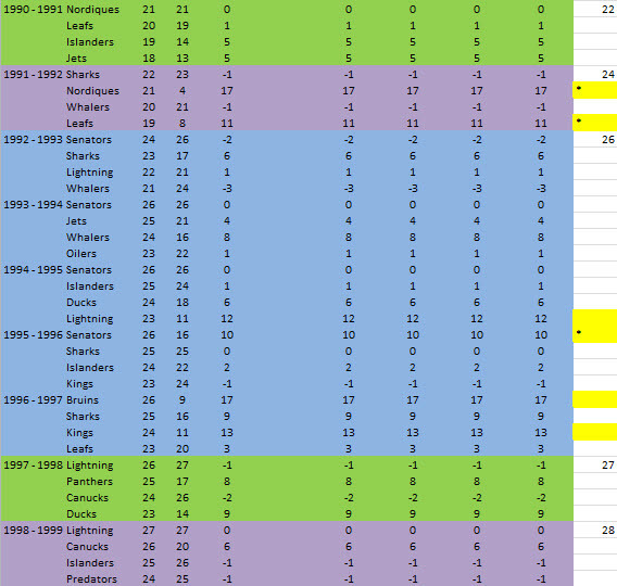 The only real gap in the list is the…wait for it…2009-2010 season featuring the Oilers, Leafs, Panthers and Blue Jackets. Four poster franchises for dysfunction and ineptitude for much of the NHL’s recent history.