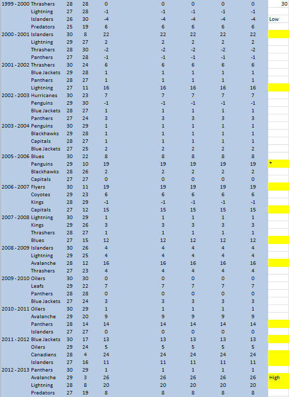 Here we have the modern NHL, 30 teams and the beginning of the draft lottery. You’ll notice that on the right hand side I’ve added a note “low” and “high”. This is, for the entire exercise, the lowest a team adjusted (in this case, they fell back) and the highest.