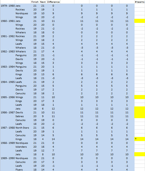 Ignore the extra columns to the right, but you can see the teams that improved in the standings by 10 places or more have a highlighted square next to them. I’ve also added an asterisk to the 1988-1989 Kings because they made a bit of a splash on the trade market that summer that contributed to their improvement the following season.