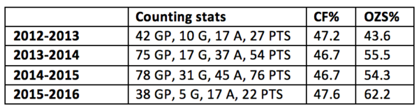 More concerning still is the fact Hudler has barely seen an uptick in possession despite a 12% bump in offensive starts. Even on a negative possession team like the Flames, a player like Hudler should be performing far better.