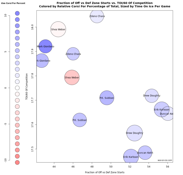 As you can see, no Norris candidate in the NHL has started more often in the defensive end than Giordano over the last two seasons. In addition, he’s consistently driven play despite his tough minutes, in fact boasting the best relative possession rate of any of the guys in question. On top of all of that, Only Zdeno Chara and Shea Weber have faced tougher opposition (once out of the two seasons in question each).