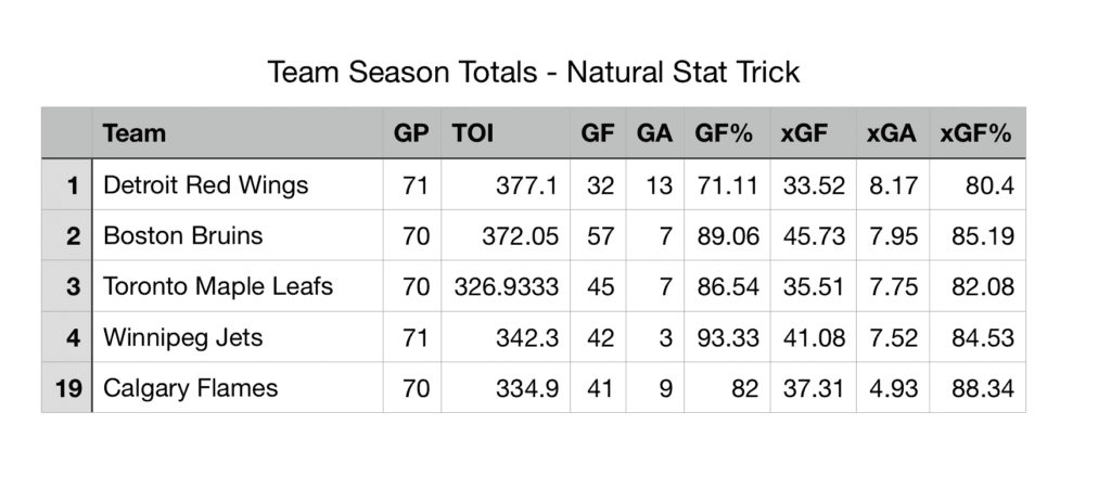 Shorthanded scoring opportunities, however, did not match the pace. The Flames posted a total 5.19 xGF while shorthanded during the regular season, trailing 18 teams with higher chance outputs. They did, however, exceed their shorthanded xGF in actual shorthanded GF with a total of six goals in six games over the course of the year. Their record on those nights? 5-1-0.