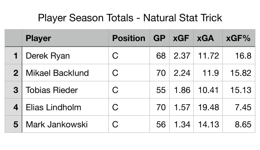Advanced stats bolster the suggestion that the Flames deploy Backlund, Rieder, and Ryan on the PK to optimize their shot at a rare shorthanded one. These guys round out the podium of Flames forwards in terms of shorthanded xGF— in individual cases, signifying the number of total expected goals during the season while this player was on the ice in the specified situation—with Elias Lindholm nabbing the fourth spot as a PK minute-muncher despite his lack of shorthanded goals himself.