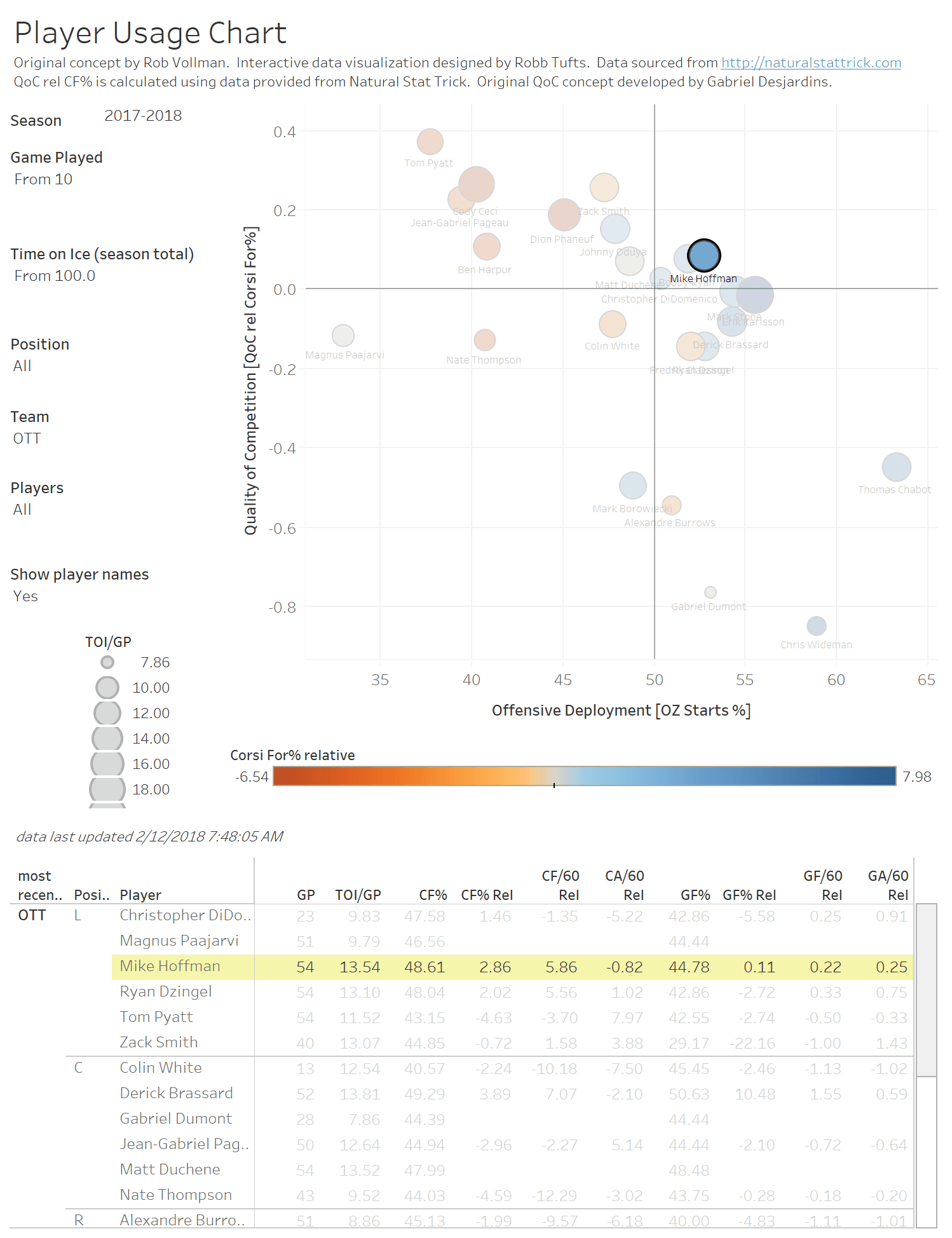 With a 5v5 CF of 48.68%, Hoffman is fourth among regular Senators in terms of possession. (Erik Karlsson is the only Senator regular above 50%, so that Hoffman is even close to being in the black speaks to being a good player on a bad team.) His offensive zone faceoffs clock in at 52.80%, third highest among regular Senators forwards.